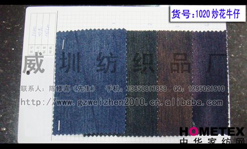 織物組織:平紋 幅寬:150cm 品名:滌棉牛仔 密度:64*47 水洗工藝:砂洗 貨號:1020炒花 重量:* 具體用途:休閑服、工作服、褲裝、時(shí)裝 別名:1020炒花 印染工藝:印花 成分及含量:65%棉,30%滌,5%氨綸 主要用途:服裝用布 ======================================================================= 以上產(chǎn)品全部現貨供應,可隨時(shí)提供樣布卡和現貨,隨時(shí)發(fā)貨。所有產(chǎn)品全部是廠(chǎng)家直銷(xiāo)價(jià),我們承諾:以超低利潤營(yíng)銷(xiāo),我 們只求銷(xiāo)售量。為保證您的利益,我司建議您在采購前先確認我們的品質(zhì)樣與顏色樣后再拿大貨,期待與您的真誠合作。因產(chǎn) 品種類(lèi)較多,具體參考未盡詳盡,如有需要,請您與我們聯(lián)系。 瑞豐紡織(中大旗艦店)坐落于國內最大的紡織面料產(chǎn)業(yè)中心—廣州中大,是一家專(zhuān)業(yè)銷(xiāo)售面料的廠(chǎng)家直銷(xiāo)商。主要經(jīng) 營(yíng)產(chǎn)品有:全棉凈色、仿記憶絲面料、全棉(TC)色織等,面料品種花達上千余種,所有產(chǎn)品全部現貨經(jīng)營(yíng)。 我們面料的品質(zhì)來(lái)源于:1、采用國內外優(yōu)質(zhì)的原材料;2、使用精良的生產(chǎn)工藝和設備;3、完善的生產(chǎn)質(zhì)量管理體系。我 們具有開(kāi)發(fā)和創(chuàng )新品種的強烈意識和優(yōu)越條件,并根據客戶(hù)需求與市場(chǎng)變化時(shí)時(shí)推出潮流面料。憑著(zhù)多年的專(zhuān)業(yè)行業(yè)經(jīng)驗,根 據客戶(hù)需求,不論客戶(hù)在全國任何地方,只要提供小樣,就可在一兩天時(shí)間內輕松獲得所需面料的信息。 批發(fā)說(shuō)明供應商支持混批 。 ============================================================= 有意請加QQ:1295021910或電話(huà)聯(lián)系。 公司名稱(chēng):威圳紡織品廠(chǎng) 聯(lián)系人:陳修喜先生 手機:13650817858 網(wǎng)址:http://www.gzweizhen2010.cn.alibaba.com =============================================================