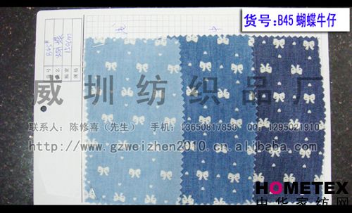 織物組織:平紋 幅寬:150cm 品名:滌棉牛仔 密度:64*47 水洗工藝:砂洗 貨號:B45蝴蝶 重量:* 具體用途:襯衫、休閑服、工作服、褲裝、時(shí)裝 別名:B45蝴蝶 印染工藝:印花 成分及含量:65%棉,35%滌 主要用途:服裝用布 ======================================================================= 以上產(chǎn)品全部現貨供應,可隨時(shí)提供樣布卡和現貨,隨時(shí)發(fā)貨。所有產(chǎn)品全部是廠(chǎng)家直銷(xiāo)價(jià),我們承諾:以超低利潤營(yíng)銷(xiāo),我 們只求銷(xiāo)售量。為保證您的利益,我司建議您在采購前先確認我們的品質(zhì)樣與顏色樣后再拿大貨,期待與您的真誠合作。因產(chǎn) 品種類(lèi)較多,具體參考未盡詳盡,如有需要,請您與我們聯(lián)系。 瑞豐紡織(中大旗艦店)坐落于國內最大的紡織面料產(chǎn)業(yè)中心—廣州中大,是一家專(zhuān)業(yè)銷(xiāo)售面料的廠(chǎng)家直銷(xiāo)商。主要經(jīng) 營(yíng)產(chǎn)品有:全棉凈色、仿記憶絲面料、全棉(TC)色織等,面料品種花達上千余種,所有產(chǎn)品全部現貨經(jīng)營(yíng)。 我們面料的品質(zhì)來(lái)源于:1、采用國內外優(yōu)質(zhì)的原材料;2、使用精良的生產(chǎn)工藝和設備;3、完善的生產(chǎn)質(zhì)量管理體系。我 們具有開(kāi)發(fā)和創(chuàng )新品種的強烈意識和優(yōu)越條件,并根據客戶(hù)需求與市場(chǎng)變化時(shí)時(shí)推出潮流面料。憑著(zhù)多年的專(zhuān)業(yè)行業(yè)經(jīng)驗,根 據客戶(hù)需求,不論客戶(hù)在全國任何地方,只要提供小樣,就可在一兩天時(shí)間內輕松獲得所需面料的信息。 批發(fā)說(shuō)明供應商支持混批 。 ============================================================= 有意請加QQ:1295021910或電話(huà)聯(lián)系。 公司名稱(chēng):威圳紡織品廠(chǎng) 聯(lián)系人:陳修喜先生 手機:13650817858 網(wǎng)址:http://www.gzweizhen2010.cn.alibaba.com =============================================================