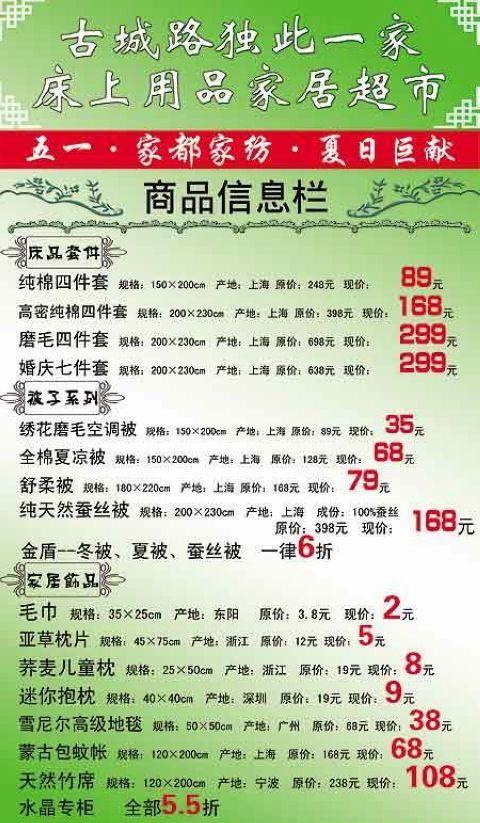 2009-4-20五一期間,南寧市古城路2-5號家都家紡推出系列促銷(xiāo)活動(dòng),現在你就可以到那里以超低的價(jià)格抱回心愛(ài)的商品嘍。床品套件:純棉四件套:原價(jià)248元,現價(jià)89元;高密純棉四件套:原價(jià)398元,現價(jià)168元;磨毛四件套:原價(jià)698元,現價(jià)299元;婚慶七件套:原價(jià)638元,現價(jià)299元。被子系列:繡花磨毛空調被...[繼續閱讀] -